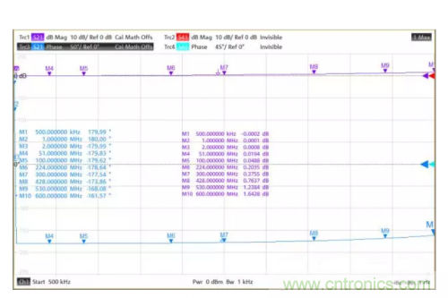 按照上面所描述的測試步驟,經(jīng)校準、端口延伸,并將差模和共模阻抗分別設置為50 Ohm、12.5 Ohm后,測試結果如圖8、9所示,插損滿足規(guī)格指標,幅度和相位不平衡特性也相對較好。圖10給出了共模抑制比CMRR的測試結果,這是使用矢網(wǎng)的Trace Math功能得到的結果,現(xiàn)在矢網(wǎng)已經(jīng)支持直接顯示CMRR測試結果,使得測試更加方便。