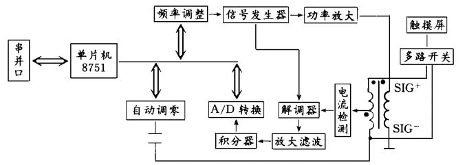加到觸摸屏的右邊電極上,觸摸屏的上邊和下邊電極全部開路,這樣在觸摸屏的X 方向上建立了交流電壓梯度,經(jīng)解調(diào)器解調(diào)和濾波后,可得到X 方向上的觸摸電流為iX= KXXV/ Zf ,其中,V為變壓器次級對于中心抽頭虛地的電壓,KX 為常量,V/ Zf 為電路等價阻抗觸摸電流。第2 種模式為將SIG+加到觸摸屏的左邊電極上,同時也加到觸摸屏的右邊電極上,這時在X 方向上建立了均勻的交流電壓。如果在觸摸屏上任意一點進行觸摸,則經(jīng)解調(diào)器解調(diào)和濾波后,得到其觸摸電流為i ZX= KZXV/ Zf ,其中,KZX為常量。由iX 和iZX得X 方向的觸摸位置坐標(biāo)為X= (KZX/ KX)·( iX/ i ZX ) ,式中,iX、iZX在以上2 種掃描模式下測得,而常量KZX/ KX 可由實驗確定。一旦確定了KZX / KX,就可計算出X 方向的任意觸摸位置坐標(biāo)X。同樣,第3 種模式是將SIG+和SIG-分別加到觸摸屏的上邊電極和下邊電極上,即可得到Y(jié)方向上的觸摸電流為i Y= KYYV/ Zf ,其中,KY 為常量。第4種模式是同時將SIG+加到觸摸屏的上邊電極和下邊電極上,得等價阻抗觸摸電流為 iZY= KZYV/ Zf ,其中,KZY為常量。也可由 iY 和 iZY得Y 方向的觸摸位置坐標(biāo)為 Y=(KZY/ KY) ( i Y/ i ZX) ,其中,常量KZY/ KY 同樣可由實驗確定。
