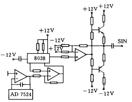 控制器的激勵信號源如圖3 所示。信號由函數(shù)信號發(fā)生器8038 產(chǎn)生,它能夠輸出正弦波和方波,正弦波用作觸摸屏的激勵信號。單片機通過 8 位 D/ A 轉(zhuǎn)換器可控制8038 的振蕩頻率,一般控制在200 kHz 左右,以避開計算機顯示器掃描信號產(chǎn)生的干擾。同時,由8038 產(chǎn)生的方波信號提供給模擬解調(diào)器,作為解調(diào)信號參考源。由于8038輸出的正弦波信號功率有限,為此在8038的正弦波信號輸出端增加了功率放大電路。