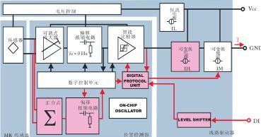為消除此噪聲對(duì)輸出信號(hào)的影響,另一封裝中裝入了信號(hào)處理專(zhuān)用集成電路(ASIC)。后者也包含一個(gè)線路驅(qū)動(dòng)器,以便為信號(hào)處理和高電壓接口提供電源電壓(圖 1)。圖 4 所示為信號(hào)處理架構(gòu)。用于故障排除的中心元件為包括調(diào)式放大器、偏移抵消電路和智能比較器。根據(jù)傳感器和編碼器輪之間的距離,可調(diào)式放大器可以與信號(hào)級(jí)匹配。對(duì)于偏移抵消電路,有一種控制系統(tǒng)(與高通濾波器不同)可消除偏移,同時(shí)將系統(tǒng)頻率保持為 0?Hz。否則,就不可能檢測(cè)到停止不動(dòng)的編碼器輪。智能比較器的臨界值是可變的,并且可設(shè)置,使磁滯處于信號(hào)振幅的 20% 和 45% 之間。這可確保充分抑制噪聲,而且振幅突降達(dá) 50% 也不會(huì)影響系統(tǒng)的正常運(yùn)轉(zhuǎn)。模擬前端的個(gè)別組件控制則通過(guò)數(shù)字接口實(shí)現(xiàn)。所述系統(tǒng)均利用仿真技術(shù)開(kāi)發(fā)和驗(yàn)證。下文將概略介紹系統(tǒng)開(kāi)發(fā),同時(shí)闡述如何使用模型來(lái)改進(jìn)設(shè)計(jì)。