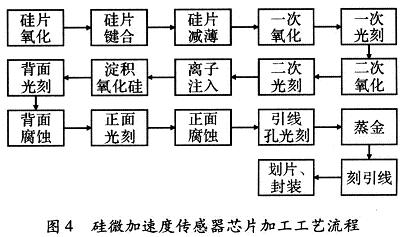 壓阻式傳感器的懸臂梁常采用CVD工藝在硅片上外延生長(zhǎng)一層外延層刻蝕而成,文中試用鍵合工藝制造壓阻式加速度傳感器。采用鍵合工藝優(yōu)點(diǎn)是能得到高質(zhì)量的外延層,且懸臂梁的厚度通過硅片減薄工藝易于得到保證,精細(xì)的硅片單面研磨,厚度誤差可以控制在0.5 μm以內(nèi);且不需要電化學(xué)自停止腐蝕,依靠EPW腐蝕液對(duì)SiO2的腐蝕速度極慢,使得腐蝕過程停止在SiO2層上,從而保證了硅片減薄后的厚度即為彈性梁的厚度。制作的傳感器芯片尺寸3 mm×5 mm,封裝在陶瓷管殼中。選n型硅片,晶向(100),直徑為50mm,厚度為300μm,電阻率為5~12 Ω·cm。傳感器芯片加工工藝流程,如圖4所示。
