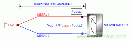 托馬斯•塞貝克在1822年發(fā)現(xiàn)了熱電偶原理。熱電偶是一種簡單的溫度測量裝置,由兩種不同金屬(金屬1和金屬2)組成(圖1)。塞貝克發(fā)現(xiàn)不同的金屬將產(chǎn)生不同的、與溫度梯度有關(guān)的電勢。如果這些金屬焊接在一起構(gòu)成溫度傳感器結(jié)(TJUNC,也稱為溫度結(jié)),另一端未連接的差分結(jié)(TCOLD,作為恒溫參考端)上將呈現(xiàn)出電壓,VOUT,該電壓與焊接結(jié)的溫度成正比。從而使熱電偶輸出隨溫度變化的電壓/電荷,無需任何電壓或電流激勵。