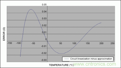 圖7. 歸一化誤差,表示溫度變化時(shí)PT100原始輸出于其近似直線之間的偏差。