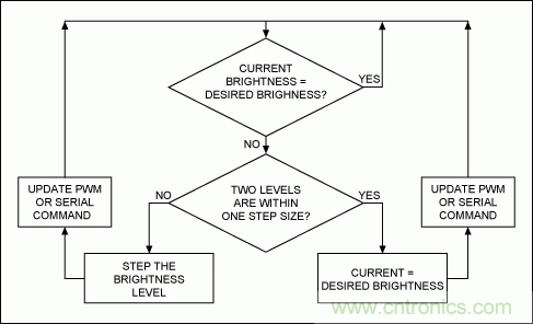 最好不要從一個亮度級直接跳轉(zhuǎn)到另一個亮度級,而是平滑上調(diào)和下調(diào)背光亮度,確保不同亮度等級之間無縫過渡。為了達到這一目的,最好采用帶有固定或不同亮度步長、可逐步調(diào)節(jié)亮度的定時中斷,也可采用帶有可控制LED輸入電流的PWM值的定時中斷,或者是能夠發(fā)送到顯示屏控制器的串行指令的定時中斷。圖8提供了這種算法的一個示例。