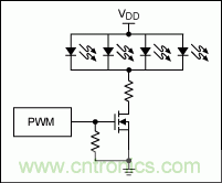 許多顯示屏模塊如今都配有一個集成控制器,用戶可以通過向控制器發(fā)送串行命令,直接設(shè)置背光亮度。如果顯示屏模塊未配備集成控制器,還可安裝一個簡單的背光控制執(zhí)行器,控制顯示屏后面用于背光照明的白光LED燈的輸入電流。實現(xiàn)這種控制的一種簡單辦法是:直接給LED串聯(lián)一個場效應晶體管(FET),使用PWM信號快速打開、關(guān)閉FET (圖5)。然而,也可以利用單一芯片(用于LED控制的MAX1698升壓轉(zhuǎn)換器)準確、可靠地調(diào)節(jié)(圖6),請參考應用筆記3866“Low-power PWM output controls LED brightness”,獲取詳細信息。