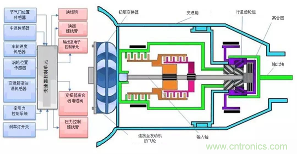 自動變速器汲取汽車發(fā)動機產(chǎn)生的功率,然后通過符合各種駕駛需求的不同的齒輪傳動比傳導這些功率。齒輪傳動比之所以不同,是為了確保發(fā)動機轉(zhuǎn)速(RPM)和供應給車輪的扭矩與當前車速和加速度匹配。來自發(fā)動機飛輪的動力通過扭矩變換器傳輸給變速器(見圖1)。