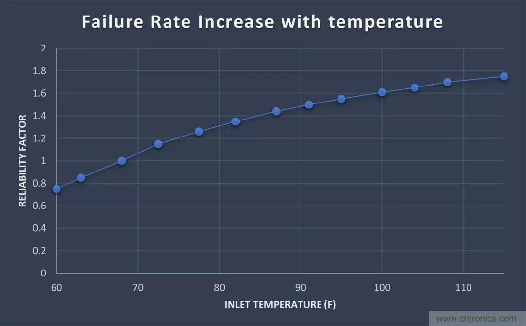 也許提高能源轉(zhuǎn)換器的效率以降低內(nèi)部溫度和提高計算壽命/可靠性是值得的,但這只有在外殼和散熱系統(tǒng)保持不變的情況下才有效。過去的經(jīng)驗法則告訴我們,溫度每升高10°C,電子器件的壽命就會縮短一半,而根據(jù)可靠性手冊可知,溫度升高10°C,半導體和電容器故障率將分別增加25%和50%左右。然而,現(xiàn)代電子產(chǎn)品都非??煽磕陀?,因而只有在很長的使用壽命和高度可靠的數(shù)字中才會體現(xiàn)出這樣的百分比變化。例如,對于數(shù)據(jù)中心,電力電子設備冷卻系統(tǒng)一直被設定為保持21°C左右的理想入口溫度,但英特爾和其他公司的研究表明,這一溫度可以提高,并且對系統(tǒng)可靠性影響不明顯。APC的一份報告中引用了美國采暖、制冷與空調(diào)工程師協(xié)會(ASHRAE)的預測,顯示在入口溫度升高20至32°C(68至90°F)時,整體設備故障率僅增加1.5倍(圖1)。數(shù)據(jù)中心的溫度每升高1攝氏度,相關的冷卻成本就會降低約7%,因此,減小機箱尺寸并允許包括電源在內(nèi)的設備能在更高溫下運行,可以在釋放機架空間的同時真正節(jié)約成本。