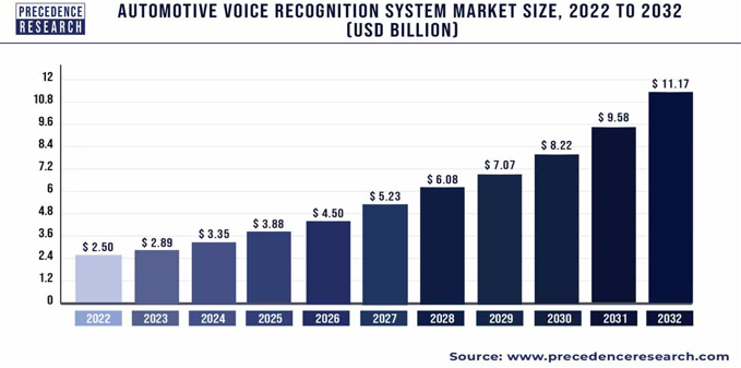 根據(jù)Precedence research的數(shù)據(jù),2023年,全球汽車語音識別系統(tǒng)市場價值為28.9億美元,預計到2032年將超過約111.7億美元,在2023年至2032年的預測期內(nèi),復合年增長率將達到16.20%。